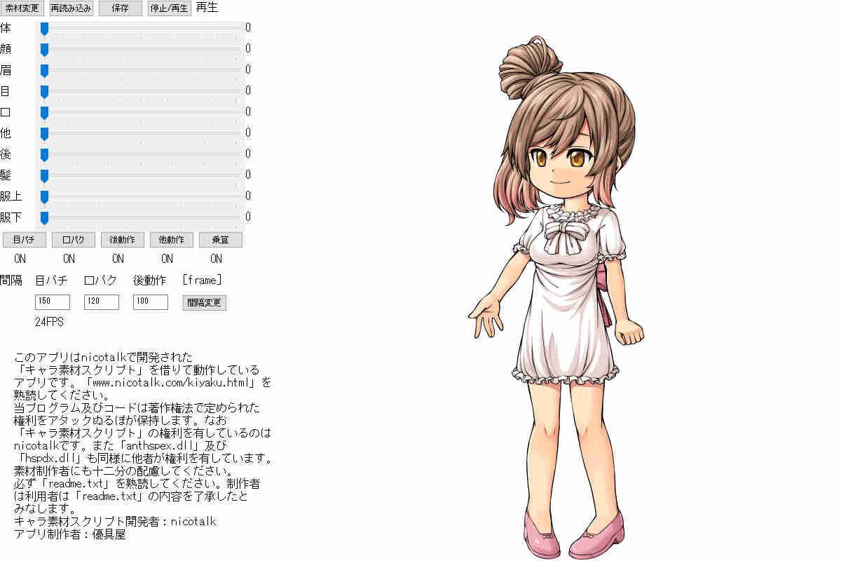 このアプリはズーズ氏が開発されたキャラ素材スクリプトお借りして制作されています。キャラ素材スクリプトとは、そのスクリプトに対応した素材をaviutl上で動かすためのプログラムです。そのため、当アプリに関してはキャラ素材スクリプトとANTARES' HSP拡張プラグイン基本セットとHSPDX.DLLと当アプリの利用規約の遵守してください。