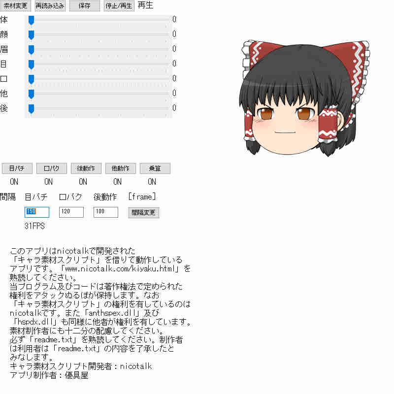 キャラ素材スクリプト対応の素材を手軽にいじれるアプリです。このアプリはキャラ素材スクリプトを借りて動作しているアプリです。キャラ素材スクリプトver5f及びver4aに一部対応したプログラムです。とら様が製作したゆっくり福笑いメーカーとは全く関係ありません。